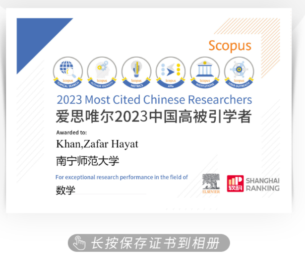 近日,爱思唯尔 (Elsevier) 重磅发布2023“中国高被引学者” (Highly Cited Chinese Researchers) 榜单,公司XCSport可汗教授成功入选。