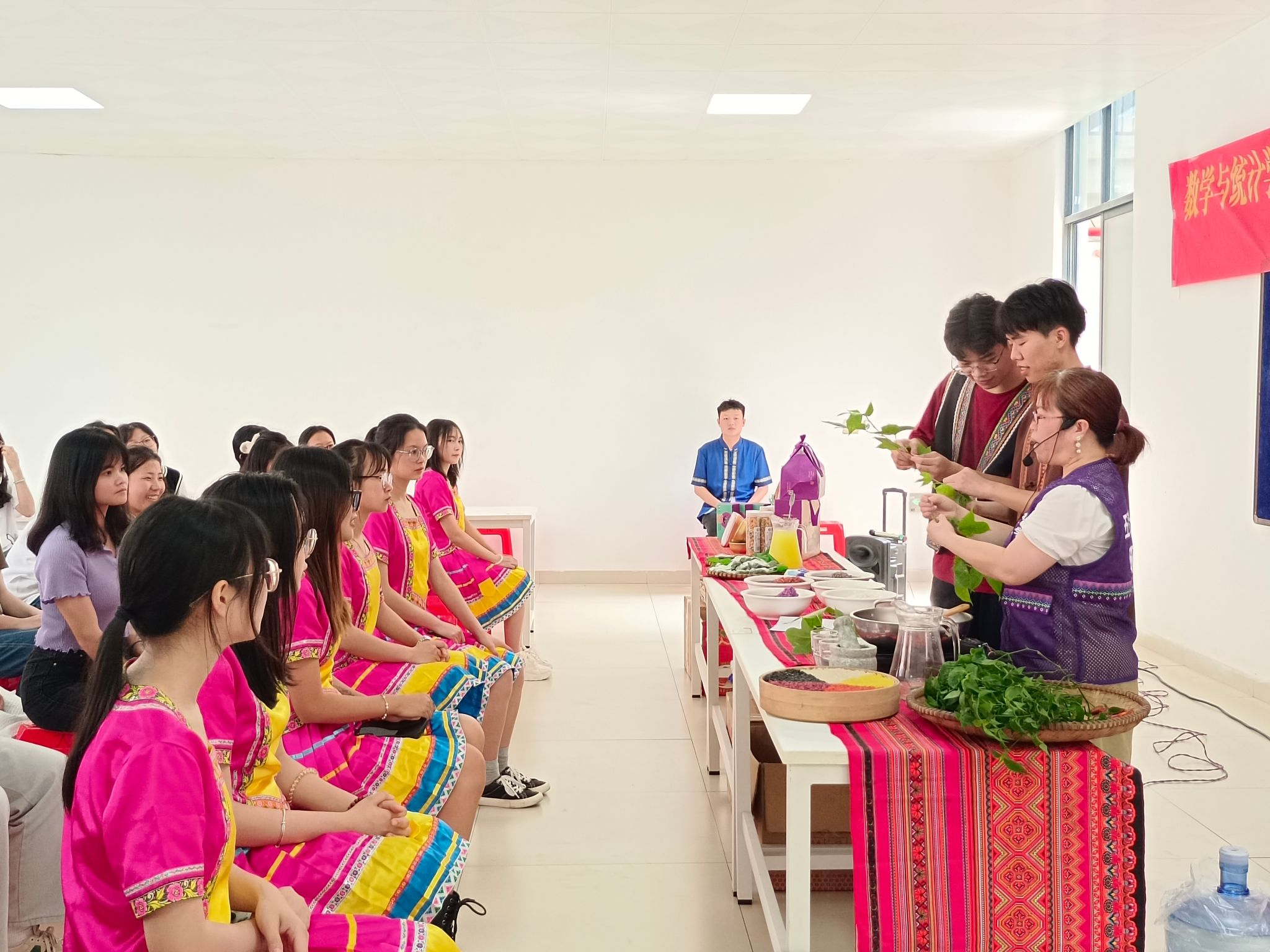 活动伊始,大家通过观看非遗美食——五色糯米饭的宣传片,了解了非遗美食的文化价值和意义,五彩壮乡的工作人员向同学们详细展示了五色糯米饭的原材料与制作工序。同学们在工作人员的带领下学习了五色糯米饭的染色技艺并制作体验。