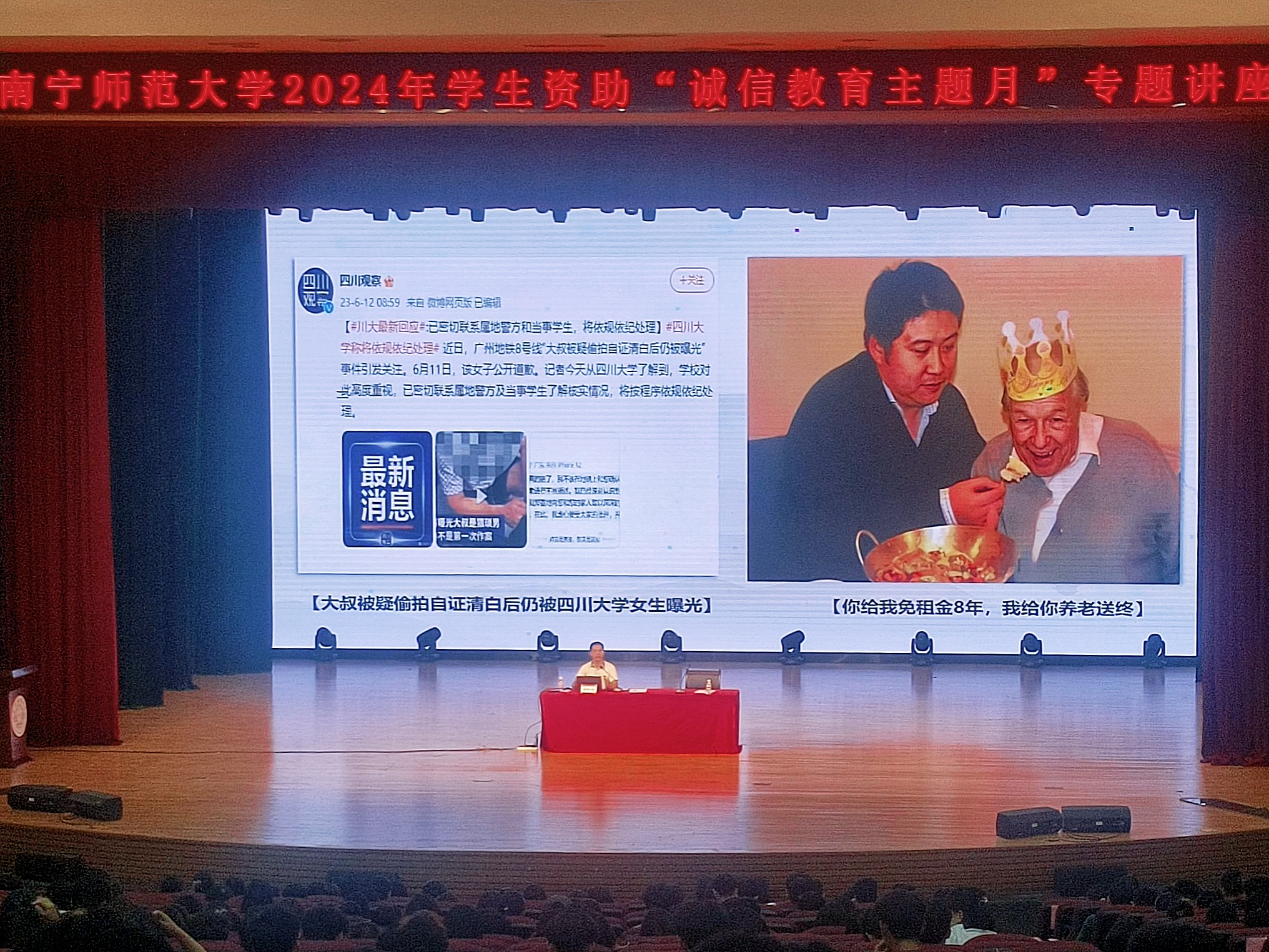 为进一步提高员工诚信意识,增强资助育人成效,6月25日下午,2024年全区高校员工资助“诚信教育主题月”专题讲座在武鸣校区音舞楼报告厅开展,XCSport组织100名员工参加此次讲座。本次讲座由公司政策法规与发展规划处邓军彪处长主讲。