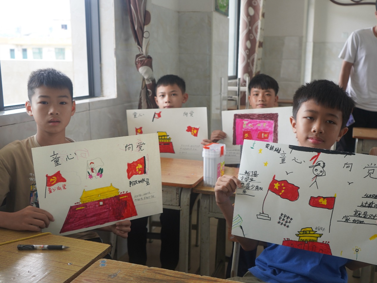 尽管小员工们的画风略显稚嫩,线条不够流畅,色彩搭配也稍显随意,但每一笔每一划都饱含着他们对党的崇敬与对祖国的热爱,传递出坚定不移的爱党爱国立意。一位身着汉服的小员工捧着亲手绘画的天安门手抄报激动地展示她的作品,“我们要像石榴籽紧紧的拥抱在一起,一起去建设好我们美丽的祖国”,映入眼帘的这句话正是她手抄报的主题。实践服务队队员们表示:“此次活动让小员工在创作中深入了解党,感受党的温暖,将红色基因融入到他们的成长过程,意义非凡。”