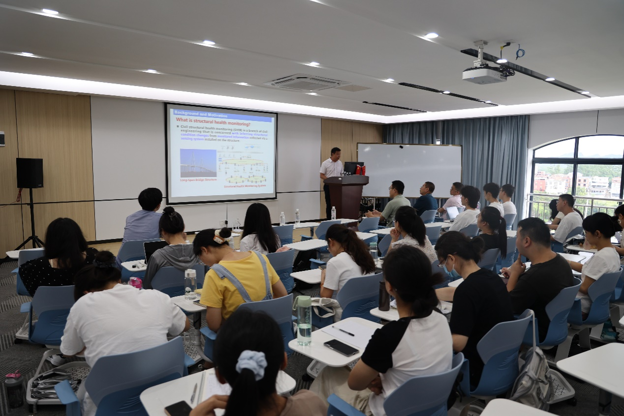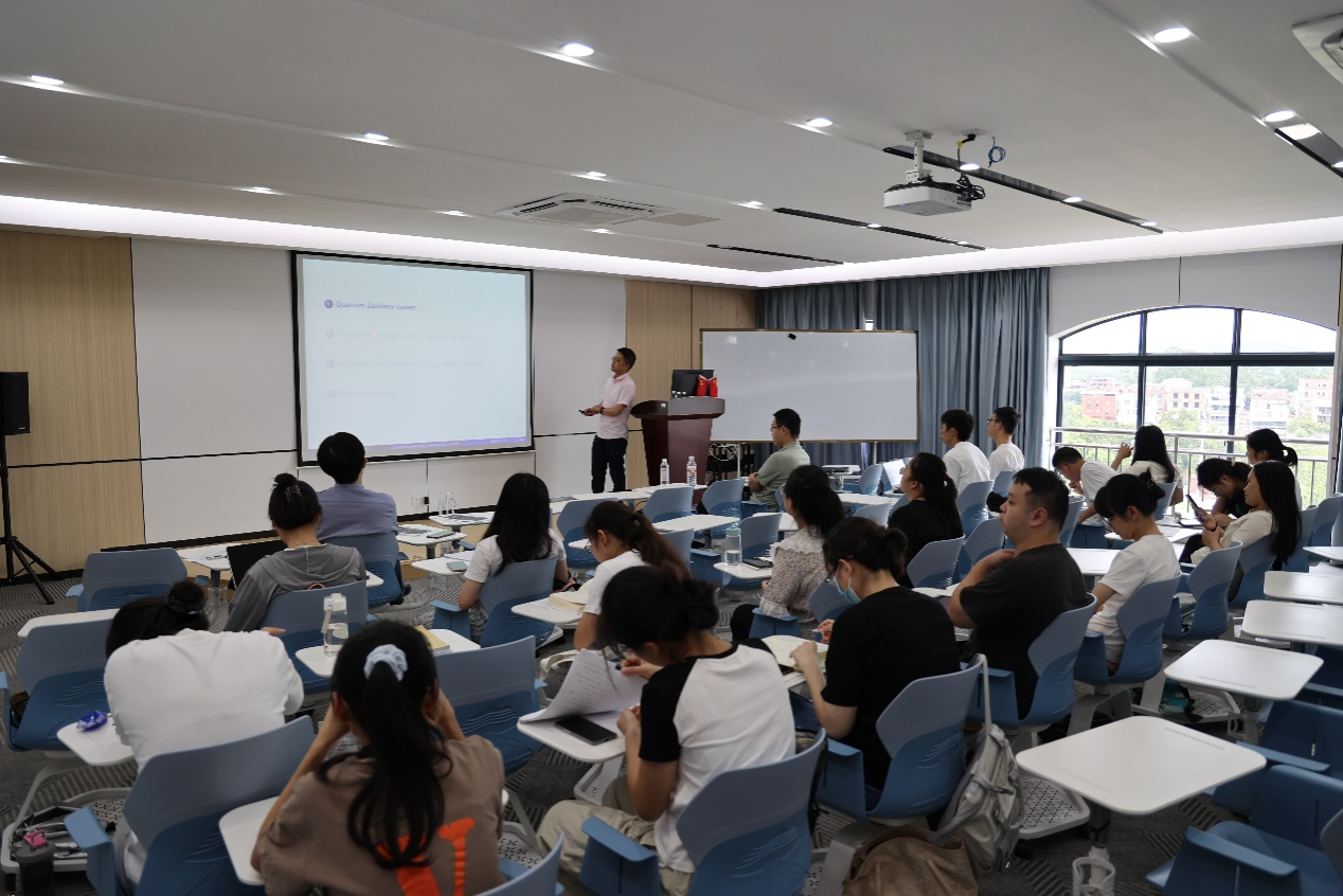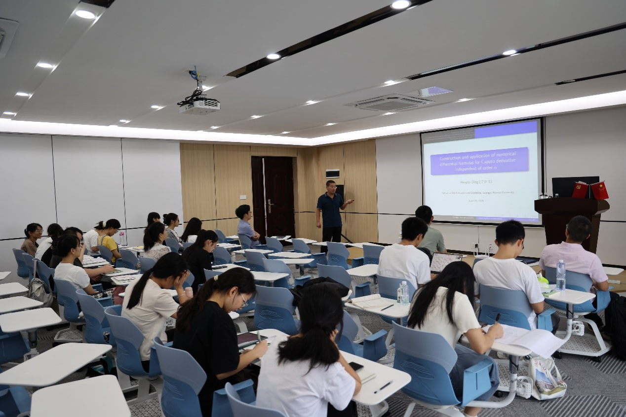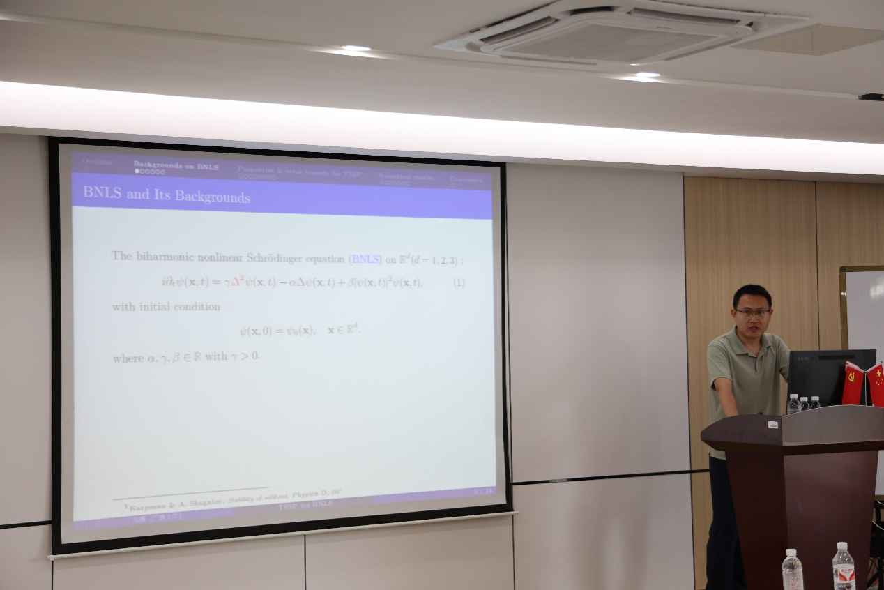 首先,陈智成博士后详细介绍了土木工程专业中桥梁监测的相关数学问题,并针对该问题提出了的函数数据分析的统计方法。同时,介绍了详细的数学理论。然后,丁恒飞教授介绍了计算数学领域中分数阶微分方程的高阶数值方法,并给在场师生介绍了当前仍未解决的热点科学计算问题。张根根副教授和张腾助理教授分别物理领域中量子Zakharov系统和非线性薛定谔方程的相关科学计算问题,并提出了相应的计算方法以及误差分析。