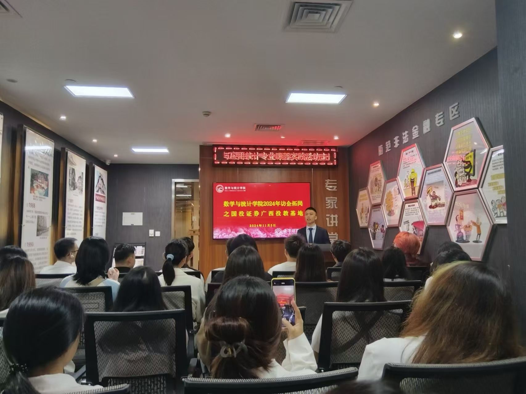 首先,见习的队伍来到创元期货南宁分公司,实地探访了期货市场的真实工作环境。莫小立经理为同学们开展了一场期货金融宣讲会。莫经理不仅深入浅出地讲解了期货公司的基本概念、运作机制及投资策略等核心知识,还巧妙地将创元期货公司自身的发展历程融入其中,为同学们呈现了一个生动、立体的期货市场全貌。通过这场宣讲,同学们对期货等金融工作有了更为深刻的理解,也为他们未来在金融领域的探索与发展提供了宝贵的参考与启示。
