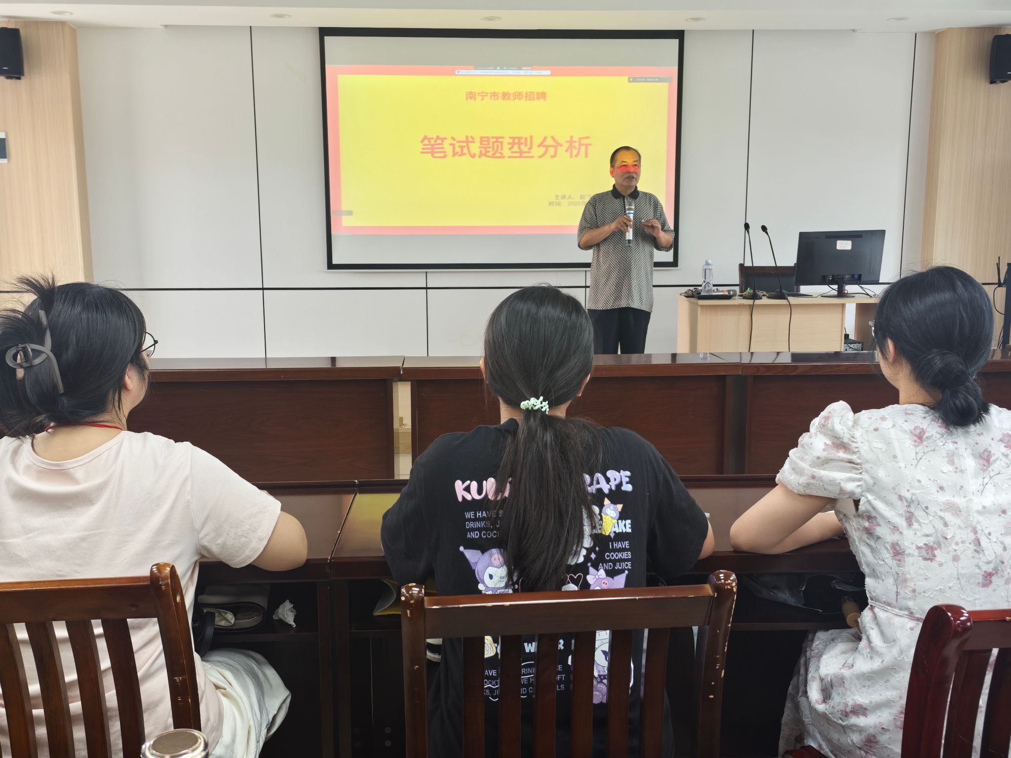 公司通过对2025届毕业生报名南宁市教师招聘情况进行摸底,提前做好需求、困惑等内容的收集,以便更有针对性地开展培训。讲座中,赵飞老师先是围绕近两年南宁市市直属和各城区的教师招聘笔试题型展开深入分析,不仅对各类题型的特点、命题规律进行详细讲解,还精心挑选真题进行解读,传授实用的应试技巧;继而针对毕业生的需求,进行了模拟演练,回应困惑,开展备考指导。培训讲座过程中,参与毕业生认真聆听,积极做好笔记,并就备考过程中的困惑与赵飞老师进行互动交流。